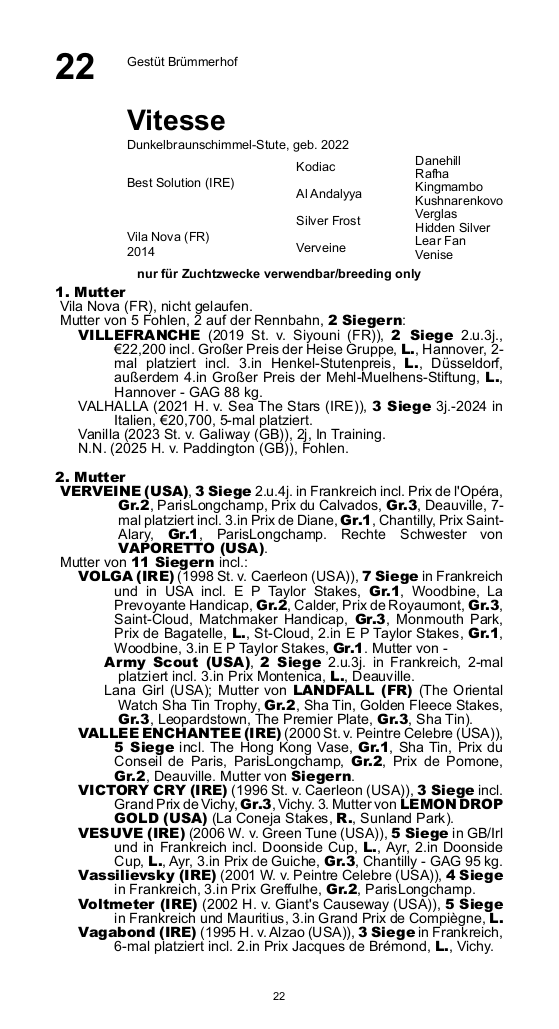 3j. Schwester zur Listensiegerin Villefranche, wird als Mutterstute angeboten.