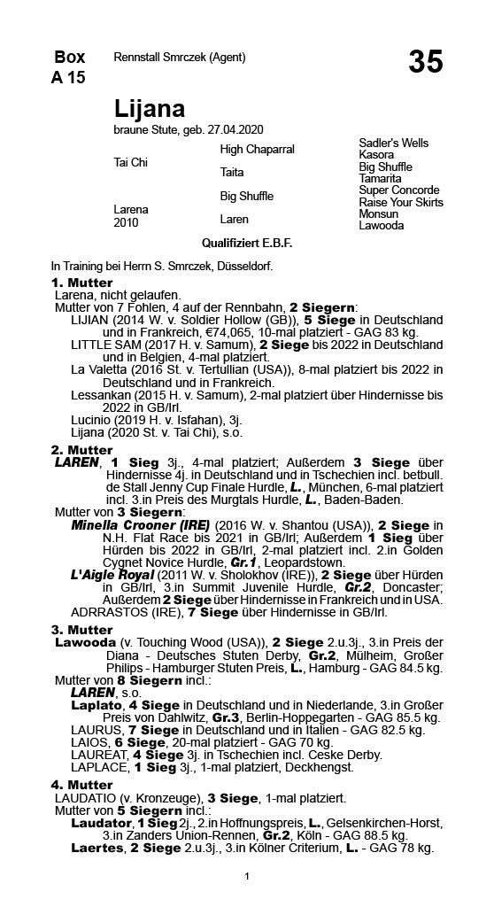 | 69 | Little Sam | Rennstall Schwarzer Maurer | Frühjahrs-Auktion 2019 | 11.000,00€ (verkauft) |