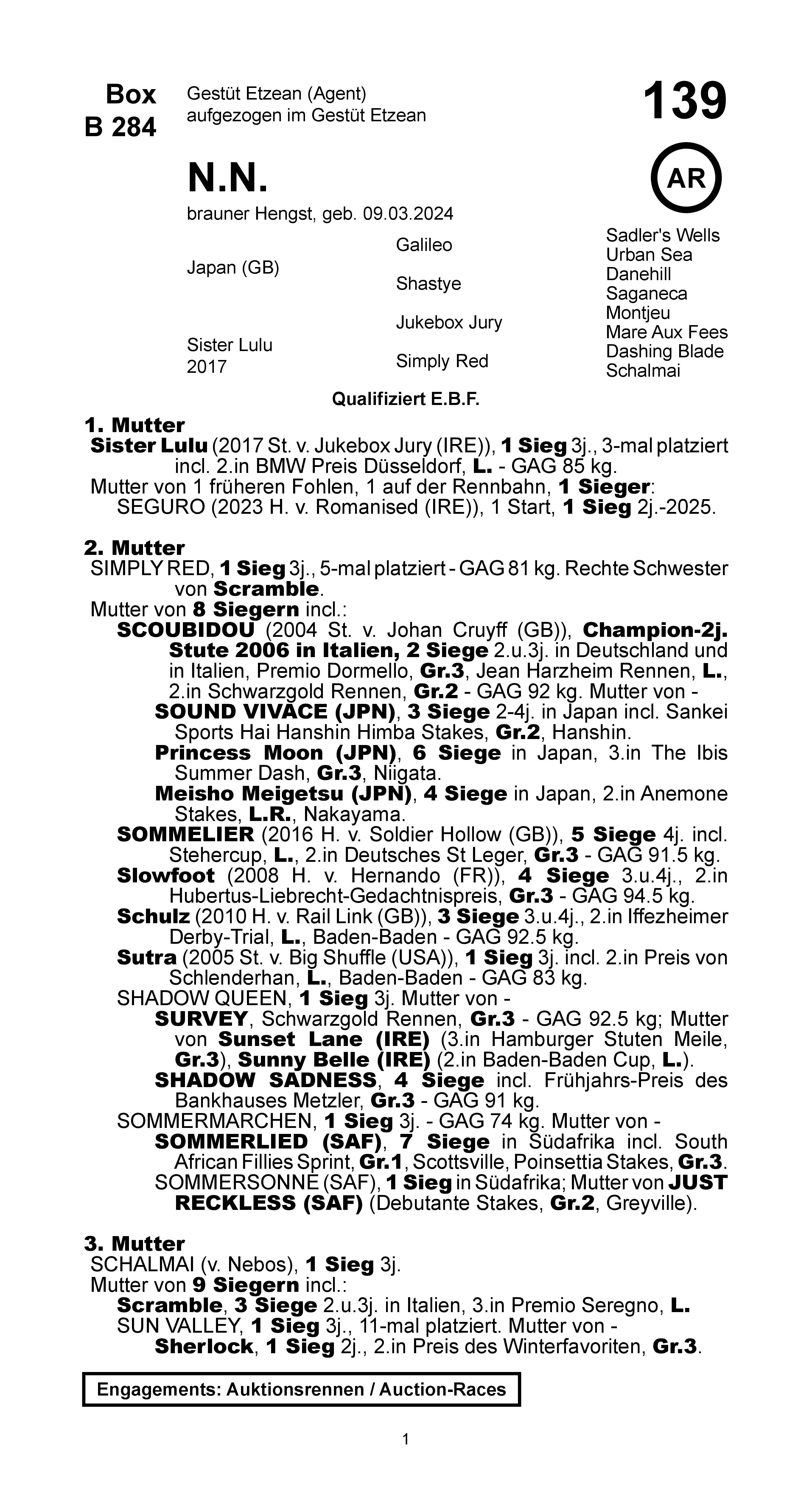 SEGURO (2023 H. v. Romanised (IRE)), 2 Starts, 1 Sieg 2j.-2025, 1-mal platziert. |